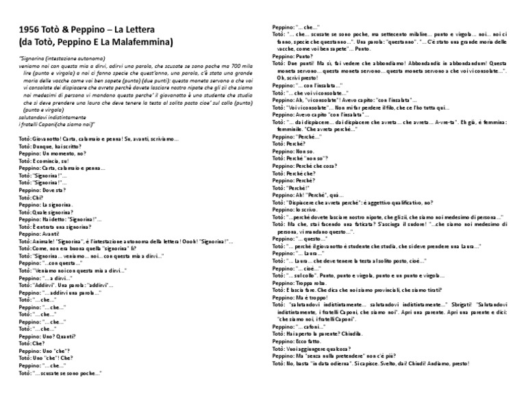 Testo lettera toto peppino e malafemmina. Totò e Peppino divisi a Berlino - Wikipedia Totò e Peppino divisi a Berlino è un film del 1962 diretto da Giorgio Bianchi e interpretato da Totò e Peppino De Filippo. È l'ultimo film in cui i nomi di Totò e Peppino compaiono nel titolo. Il film è anche l'ultimo sceneggiato per Totò dalla coppia Age & Scarpelli Totò, Peppino e... la dolce vita - Wikipedia Totò, Peppino e... la dolce vita è un film del 1961 diretto da Sergio Corbucci ed interpretato da Totò e Peppino De Filippo.Il film è una parodia della pellicola girata l'anno precedente da Federico Fellini La dolce vita riutilizzando gran parte della costosa scenografia di via Veneto allestita per quel film. Peppino De Filippo - Wikipedia Peppino De Filippo, a volte chiamato anche solo Peppino, all'anagrafe Giuseppe De Filippo (Napoli, 24 agosto 1903 – Roma, 26 gennaio 1980), è stato un attore, comico e commediografo italiano. È stato uno dei più importanti e apprezzati attori comici italiani, in ruoli sia di protagonista sia di coprotagonista. Un turco napoletano - Wikipedia Un turco napoletano è un film del 1953 diretto da Mario Mattoli.. Adattamento al grande schermo della farsa Nu turco napulitano di Eduardo Scarpetta, è interpretato da Totò, primo film del trittico scarpettiano, completato da Miseria e nobiltà e Il medico dei pazzi, entrambi del 1954, girati tutti a colori sempre con Mario Mattoli dietro la cinepresa e con Totò nei panni di Felice ...