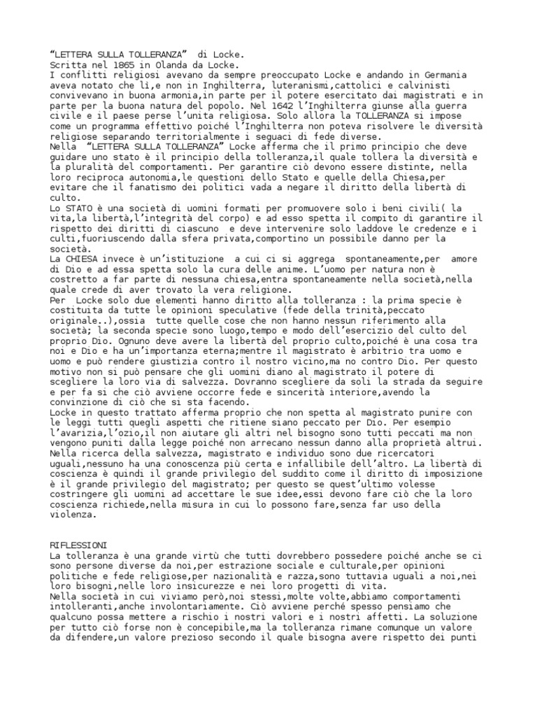 Lettera Sulla Tolleranza Locke - LETTERA SULLA TOLLERANZA ... - StuDocu Anteprima del testo LETTERA SULLA TOLLERANZA, JOHN LOCKE 1685. Introduzione. un classico della letteratura liberale moderna il suo destino non molto diverso dalle altre opere del medesimo periodo, che hanno come culla ideale Tutte presentano una precisa: che gli uomini con credenze religiose differenti possano convivere nella medesima politica.