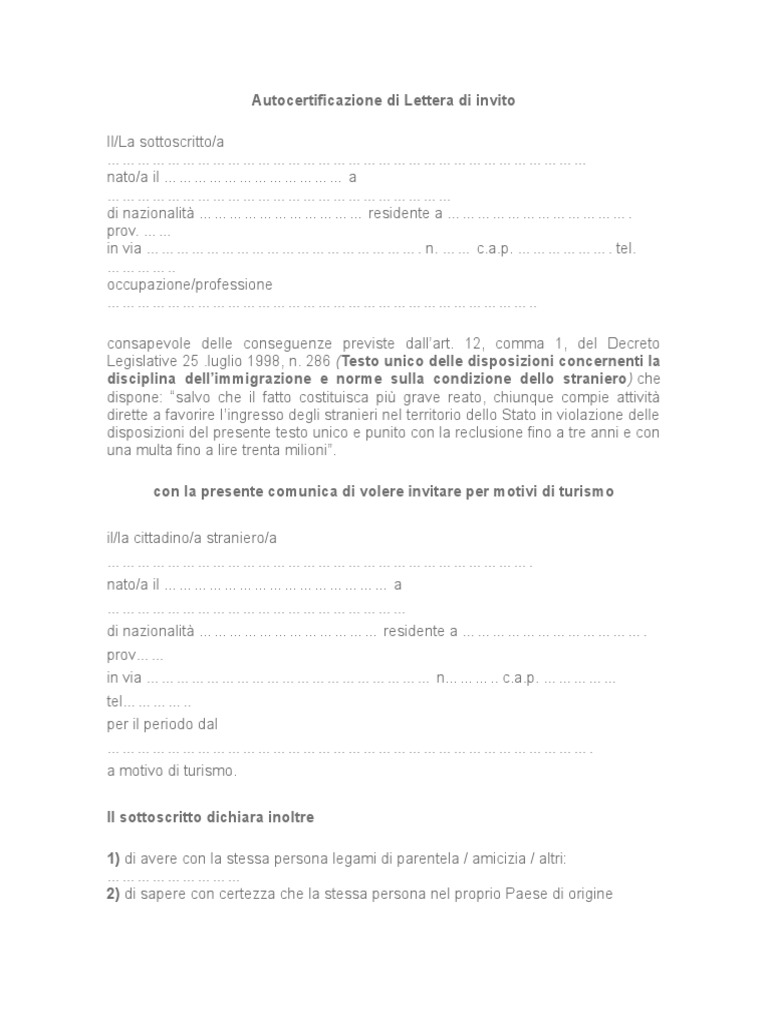 Lettera di invito per stranieri 2020 - cos'è e come si fa? La lettera va inviata al cittadino straniero che vuole venire come ospite in Italia e sarà sua cura portarla all' Ambasciata Italiana o al Consolato d'Italia presente nel suo paese, per ottenere il visto d'ingresso per turismo. Alcune Ambasciate accettano la lettera d'invito a norma di autocertificazione senza firma autenticata, solo ... Lettera di invito 2022: la procedura completa! - stranieriditalia Come inviare la lettera di invito per staraniere la lettera d'invito si deve inviare in originale al paese dello straniero che invitiamo in Italia. Compresa una copia firmata del documento di identità. Siamo in grado di inviare via e-mail se lo desideriamo fino a quando inviamo l'originale. Lettera di invito per stranieri 2022: Tutto ciò che devi sapere La lettera d'invito per stranieri 2022 è un documento con il quale il cittadino straniero regolarmente soggiornante in Italia o il cittadino italiano può invitare un amico o un parente per venire in Italia e soggiornare per un breve periodo sul suolo italiano. In questa lettera il dichiarante deve indicare chi si occuperà del vitto, dell ...